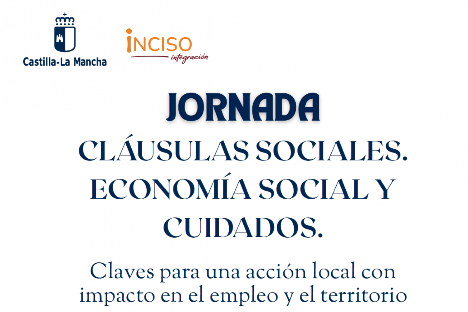 INCISO Integración celebrará el próximo 19 de febrero la jornada autonómica “Cláusulas sociales, economía social y cuidados: claves para una acción local con impacto en el empleo y el territorio”, que tendrá lugar en el Salón de Actos de la Delegación de Economía y Empresas (Ronda de Calatrava, 5 – Ciudad Real) y que está enmarcada dentro del proyecto “Economía Social y Cuidados: Guía para la acción local en Castilla-La Mancha”, desarrollado al amparo de la Línea 3 de subvenciones para actividades de formación, difusión y fomento de la economía social vinculadas al empleo, impulsada por la Junta de Comunidades de Castilla-La Mancha.