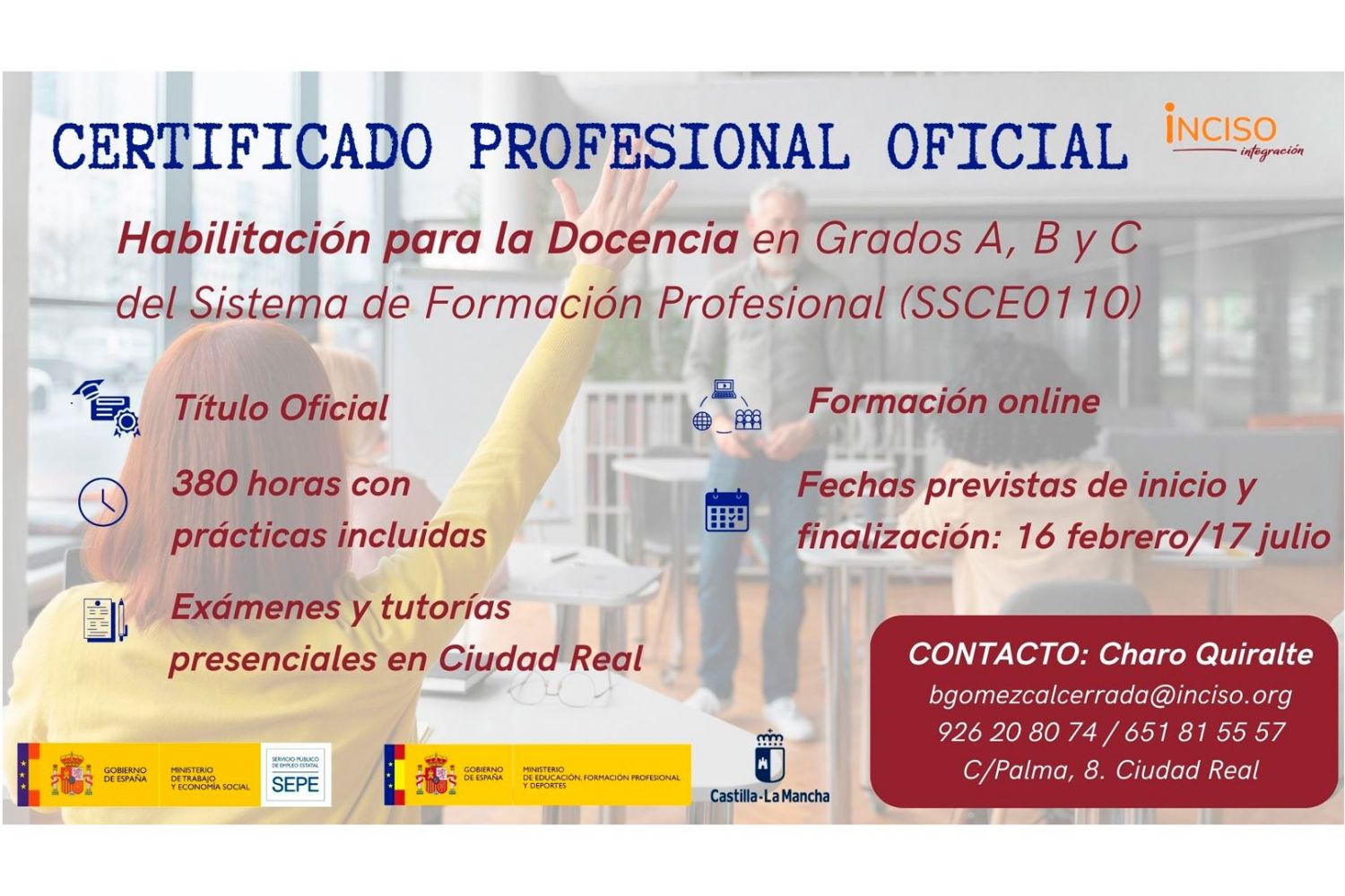 INCISO Integración imparte la formación para obtener el “Certificado Profesional Oficial. Habilitación para la Docencia en grados A, B y C del Sistema de Formación Profesional (SSCE0110)”